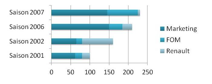 Une année 2000 de transition. 2001 encore sous le nom de Benetton, mais avec un investissement de Renault de l’ordre de 90 millions de dollars (dont 20 en sponsoring direct), puis un investissement de 170 millions de dollars durant les saisons 2002 et 2003 (dont 80 millions en sponsoring direct). Avant de réduire ensuite la part du constructeur à l’horizon 2004 avec un sponsoring devant représenter 50% du budget et une augmentation des revenus des prochains Accords Concordes. En 2006, le budget de l’équipe française était de 305 millions de dollars. 150 millions de dollars provenait des sponsors, 120 millions de dollars de Renault (dont 25 millions en sponsoring) et 35 millions des droits FOM. En 2007, le budget de l’équipe française était de 325 millions de dollars, avec 145 millions de dollars de sponsoring, 80 millions de droits FOM et un investissement du constructeur français de 100 millions de dollars (dont 5 millions en sponsoring). Sauf que le manque de compétitivité et le retour de Fernando Alonso en 2008 et 2009 vont faire augmenter la part du constructeur français. Mais l’idée était là.