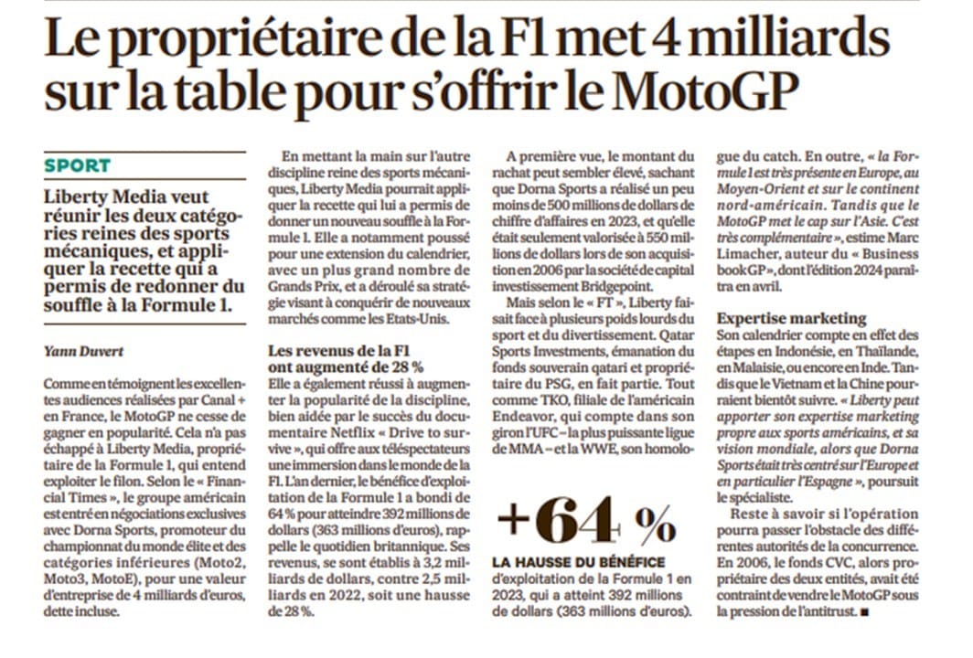 Le propriétaire de la F1 met 4 milliards pour racheter la Moto GP (Les Echos 28/03/24)